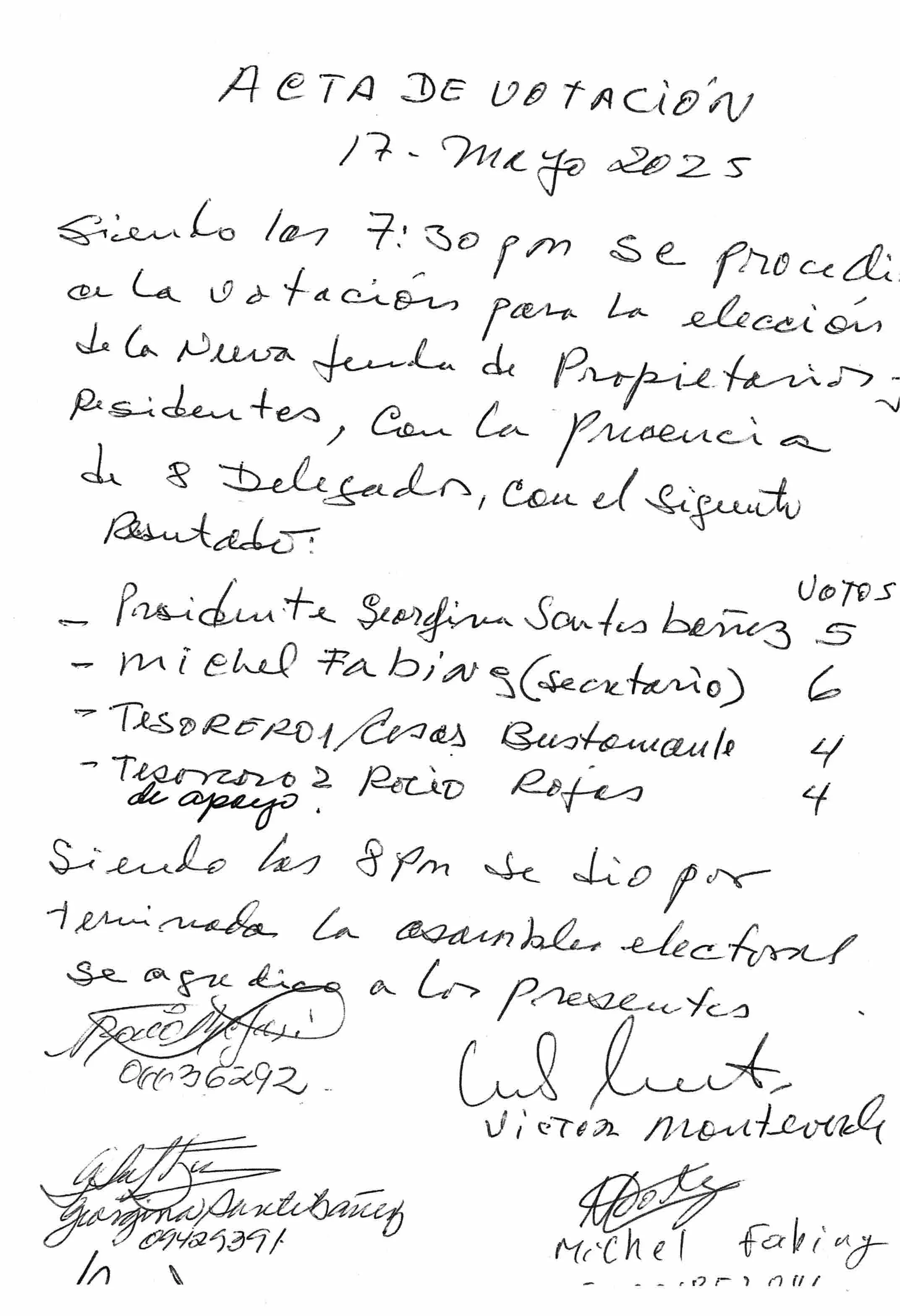 Resultados de la Votación de la Nueva Junta Directiva de la Asociación de Propietarios – 17 de Mayo 2025